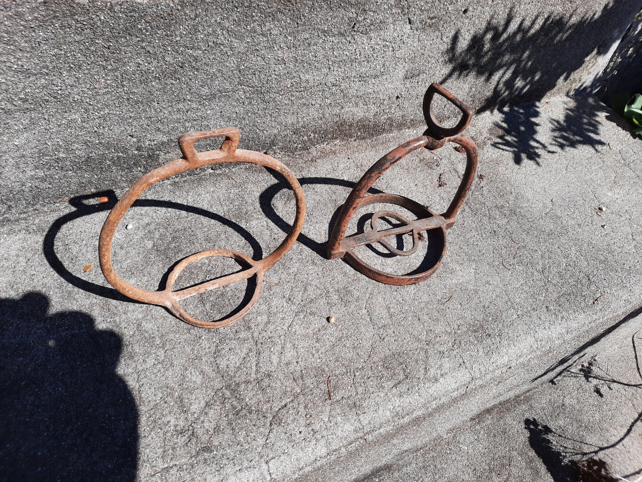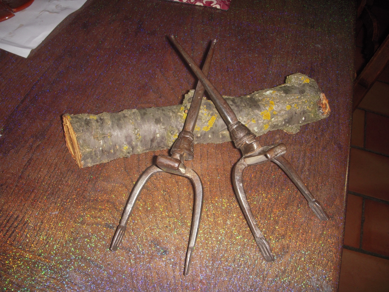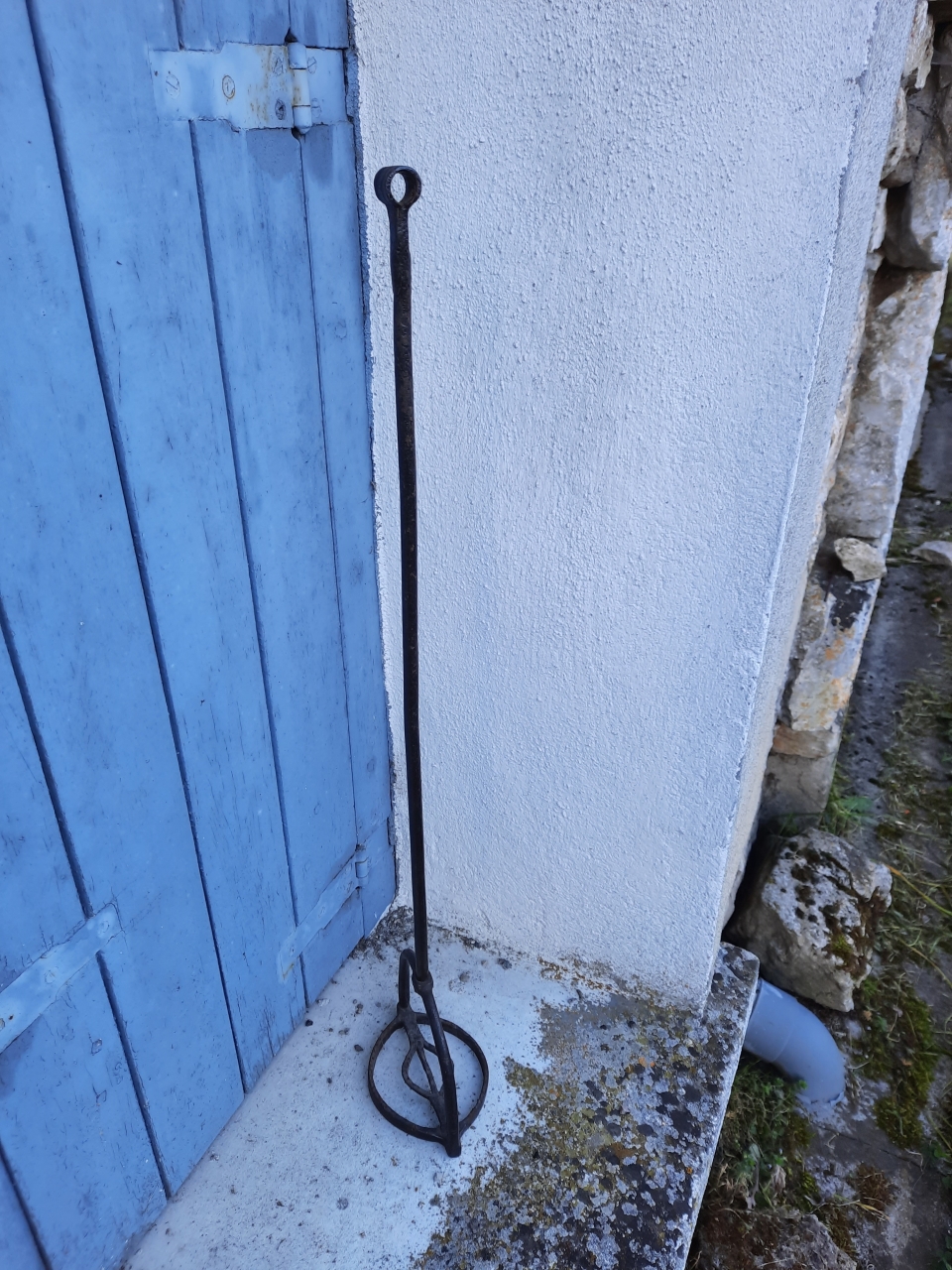 | Dire merci | Dans la rubrique objets insolites, à quoi peut servir ce truc là. Il s'agit d'un étrier à grille à tourillon, à la place du tourillon est soudée à la forge une tige de 60 cm au bout de laquelle est formé un trou pour recevoir une poignée en bois. Le premier qui trouve gagne.... rien du tout.![]() |