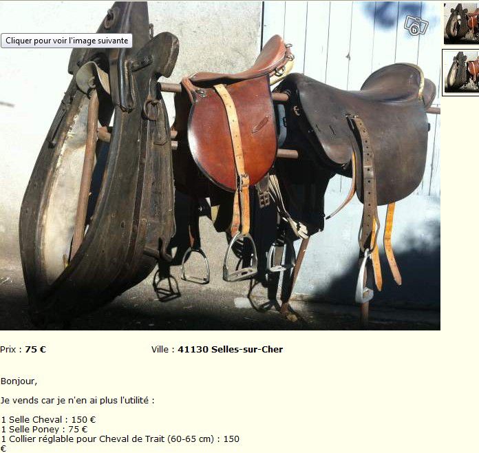 Déconnecté | Lien annonce un peu trompeuse ![]() on pourrait croire que c'est l'ensemble à 75€. la vieille selle semble utilisée. |