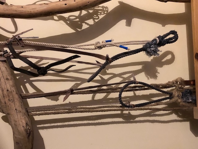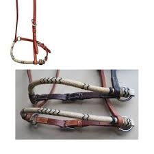 | Dire merci | (En observant on peut voir plusieurs constructions et constituants du bosal ou assemblages sur ces trois exemples plus haut. Il ne faut pas oublier qu'un bosal se doit d'épouser le chamfrein de l'animal. (donc un trop rigide et épais n'épousera pas le nez). De même des noeuds ou des "noeuds d'attache" qui permette d'attacher le montant c'est pas cool ... ![]() On peut attacher un bosal en cuir autour d'une piece de bois pour le former (au nez du cheval sur lequel il ira) pour les modeles cuirs ! On peut ensuite régler l'espace sous auge en passant les renes plus ou moins de fois comme dans la photo du dessus. On peut y voir deux interpretations du double strand. avec shoo fly intégré pour l'un. Le noeud (bouton central) du bosal permet deux choses l'écartement des deux brins (passage des renes de crins) et contre poids. En fait tout est réfléchi ,comme dirais un youtubeur cowboy "be safe , be logical and be practical" ou une diatribe comme ça. Le montant doit être souple ,bien plus que nos filets pour la douceur mais surtout pour accompagner le moindre mouvement. On peut regarder aussi les différents noeuds et leur assemblage entre les différents constituants , l'absence de bouclerie n'est pas néfaste, elle est parfois même mise en avant comme une philosophie entre les pro fer (mors et boucle = barbares et durs ) contre les sans fers! Il y a des noeuds de sous gorge pour éloigner les montants des yeux, l'emplacement des montant sur le bosal contribue à une bonne "balance " de l'appareil. |