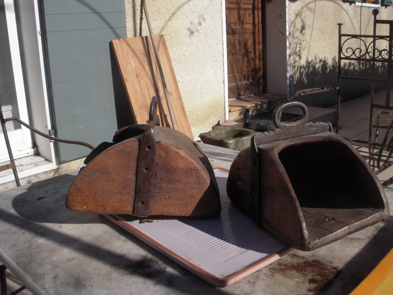 DéconnectéDire merci | ![]() ![]() ![]() voici une paire d'étriers portugais, ce sont des étriers de campinos gardiens de troupeaux, très volumineux, sur des selles plus luxueuses ils peuvent ètres décorés de métal ou sculptés |