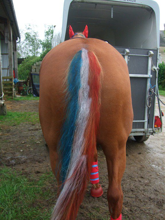 | Dire merci | J'ai cru comprendre des extensions clip. Ce n'est pas plus "jouet" que les brins de laine qu'on même à la tresse d'étalon pour les traits ou les rubans bordeaux du tressage des chevaux du Cadre Noir et là, on trouve ça "classe" ! Ayant une jument lusitanienne, je verrais bien ça (une seule couleur ajoutée) Je ne vois pas de mal à mettre en valeur son cheval un jour de spectacle, c'est pas pire qu'un piontage, c'est le côté traditionnel qui nous le fait trouver "beau" ou pas. Pour l'eye-liner, c'est très pratiqué chez les PS arabes depuis fort longtemps... |