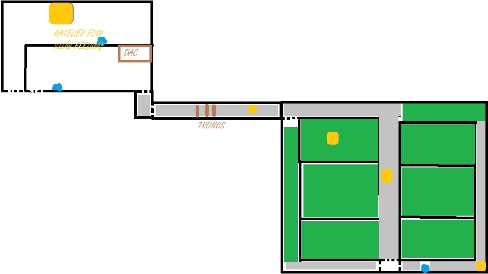 | Dire merci | bon j'ai pas fini, mais j'y travaille la partie des parcs fait 1 hectare et demi le paddock coupé en deux en haut à gauche fait 50m sur 30m de large vous en pensez quoi ? que me conseillez vous d'intégrer en plus ? j'ai mis les troncs mais que mettre d'autre ? je peux avoir des pédiluves à bovin pour faire passer dans l'eau mais j'ai peur du développement des bactéries et que ça fasse bouillon de culture ![]() |