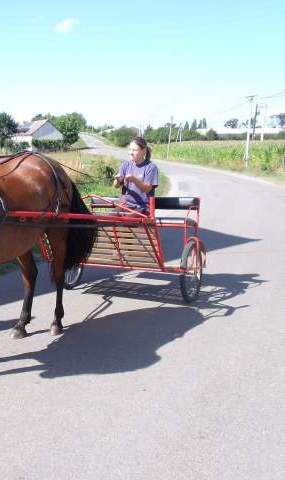 | Dire merci | je ne sais vraiment quel age elle a, mais a mon avis, plus de 10 ans... en fait, j'avais achetée une ponette dans un état pitoyable et le mec ne me lachait pas la ponette si je ne prenais pas le sulky..... du coup, pour aider cette pauvre ponette, j'ai pris le lot...... j'ai replacée la miss dans une bonne famille et gardé le sulky, ça fait longtemps que je veux en faire...... du coup, je veux la refaire a fond et atteler ma petite derniére arrivée ![]() |