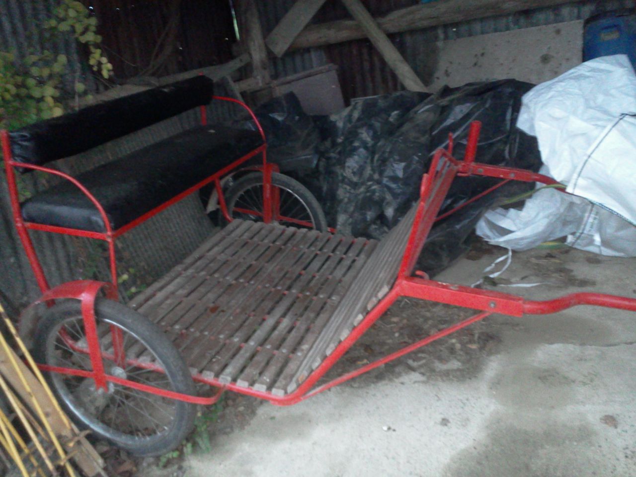 | Dire merci | voilà, je l'ai mis dans le forum attelage, mais je veux le mettre ici aussi, car je souhaite avoir un max d'idées![]() alors voilà, a la maison, j'ai un vieux sulky qui a l'heure actuel, je ne le vois pas derriére un cheval... il a une armature en fer rond, et des petite lattes en bois pour faire le planchet, le siége et le dossié.... les brancards sont décalé l'un part rapport a l'autre, car l'un d'eux a était ressoudé.... il n'a pas de freins, pas d'amortisseurs et en fait, aucun confort pour moi comme pour le cheval.... du coup, j'aimerais le refaire en entier..... le planchet va être refait en planche avec une tole d'alu par dessu, je vais me faire un siége en mousse recouvert de tissus effet cuir, pareil pour le dossié... sous le siége, je vais fermer le trou pour en faire une sorte de boite a outils pour mettre de quoi regonfler les roues, un gilet de secu avec triangle et bien d'autre.... mon beau pére, le roi de la mecanique auto, va m'installer des freins avec un systéme de pédale.... je vais ajouter des babioles genre, un support a stick, une petite tête de cheval pour enrouler les rennes et 2 ou 3 trucs de ce style...... pour 2 choses, j'ai besoins de vous..... le premiere: j'aimerais installer des feux avant et arriére, mais de quel type? a piles comme les vélos, ou avec un systéme de batterie avec des feux de voiture?????? la deuxiéme: est ce possible de faire des brancards démontables? est ce que ça risque de casser facilement même si les materiaux utilisés sont trés costauds????????? et puis, sur le tout de mon projet, vous en pensez quoi? avez vous d'autres idées que j'oublie???? merci de m'aider.... je vous mets des photos du sulky comme il est en ce moment ce soir..... |
