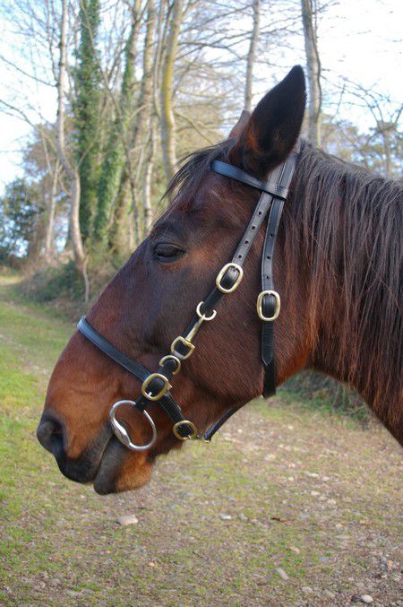DéconnectéDire merci | le brun clair soit tu laisse le réglage comme ça pour la hauteur de muserole, et la sangle pres de la comissure risque fort de faire pincette lors d'une action de mors, soit tu la remonte et le carré de licol vient frotter sur l'apophyse sur le cheval blanc qui a une tete plus longe ça devrait mieux se passer, mais si tu remonte le tout, c'est la "sous ganache" qui n'est plus à la bonne place De plus j'ai un gros doute sur la répartition de la tension du carré de licol sur un cuir cousu en oblique. Je crains une déchirure précoce (mais faut voir en vrai, là je fais que supposer) pour le brun foncé le carré de licol avec une "patte" à l'intérieur. Il faut normalement introduire la patte dans la couture du nez de la muserole pour l'empecher de "tomber" vers l'avant (mais cette erreur est très courante) |