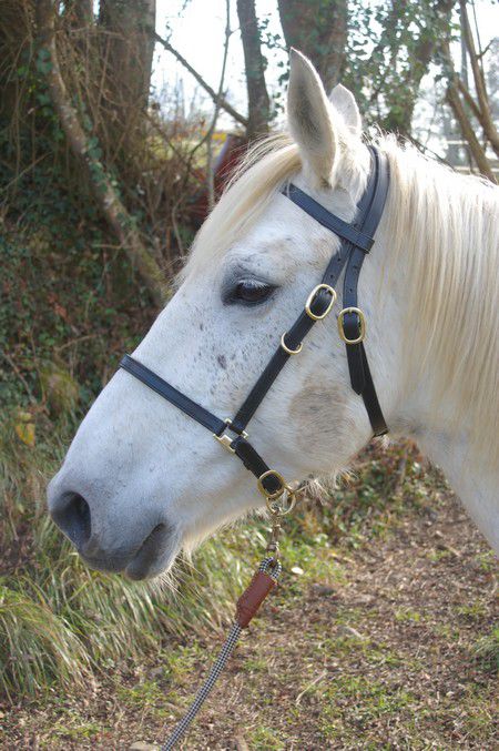 | Dire merci | J'ai le meme probleme avec mon mérens: frontal et sous gorge trop justes, mais tête très courte, donc les montants meme en taille cheval sont trop grands J'ai un licol taille trait qui est immense pour lui En attendant le filet sur mesure, j'ai retiré muserolle ET frontal, et ma foi, pas de souci particulier Tu peux peut-etre essayer de virer le frontal pour ta grise... |