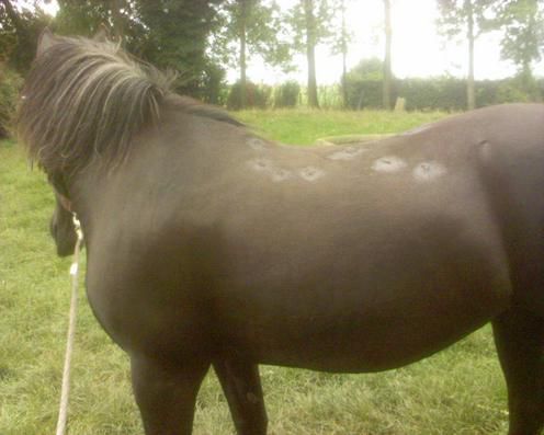 | Dire merci | voilà, à quoi peut etre due une éruption cutanée sur un cheval(plein de "boutons"sur encolure et flancs assez larges) et qui revient de manière cyclique,environ toutes les 3semaines? sachant que le cheval va très bien ne se gratte pas,est en forme et a de beaux crottins.. j'ai lu sur internet la possibilité d'allergie à la luzerne? |