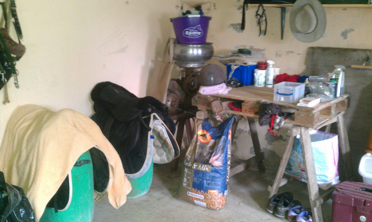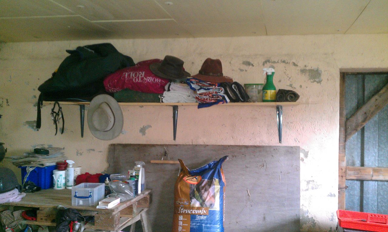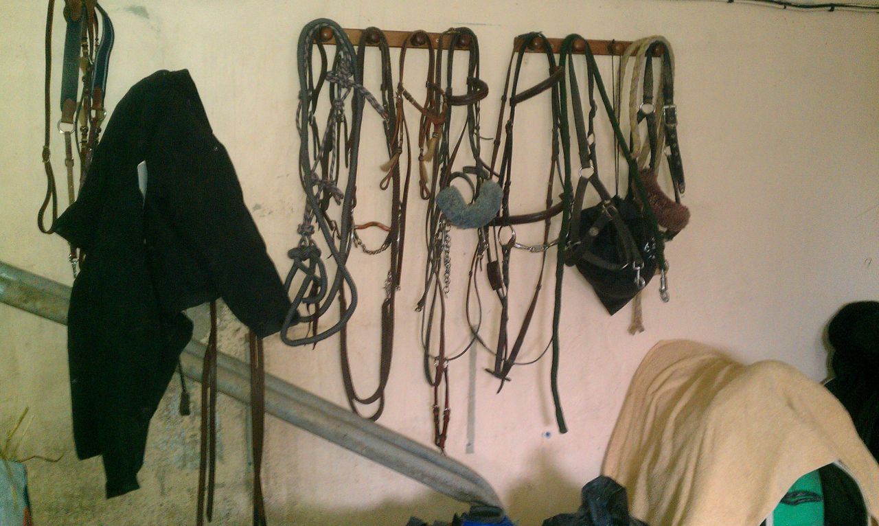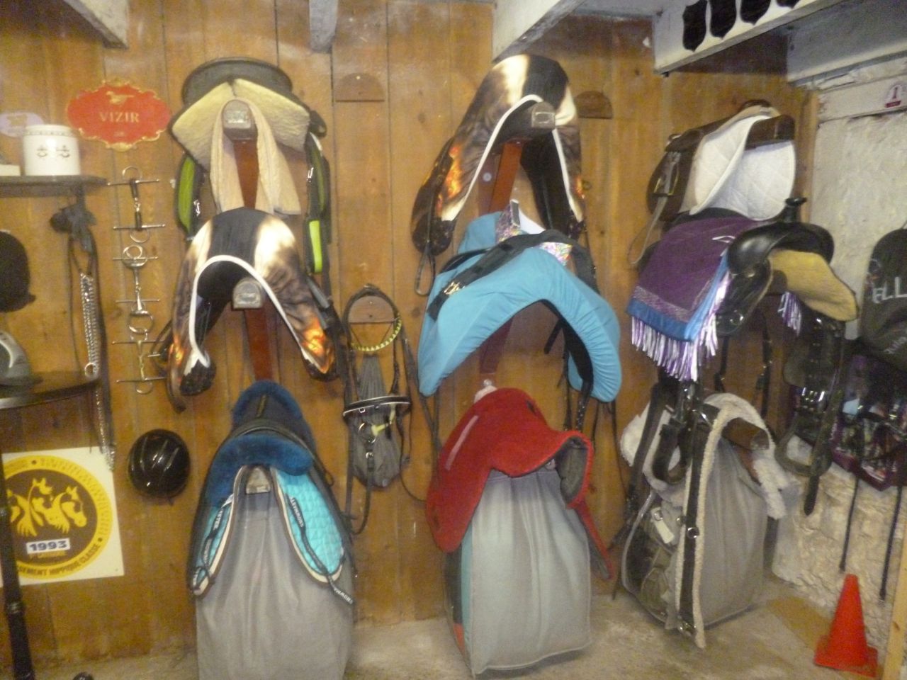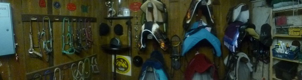 | Dire merci | une question m'interpelle pourquoi pas de tréteau pour un club? Je trouve ça bien pratique moi et pas cher en plus! Voici ma sellerie (deux chevaux) porte selle Les tubes des étagères sont de la récup sur des salons d'exposants qui jetaient. Dessus une plaque d'agglo. Le nuage au fond est de la peinture tableau, je note mes vermifuges dessus Les crochets pour les licos et une vieille armoire de salle de bain qui trainait dans le garage d'amis pour mettre mes produits, protec ect ET mon super carrelage D |