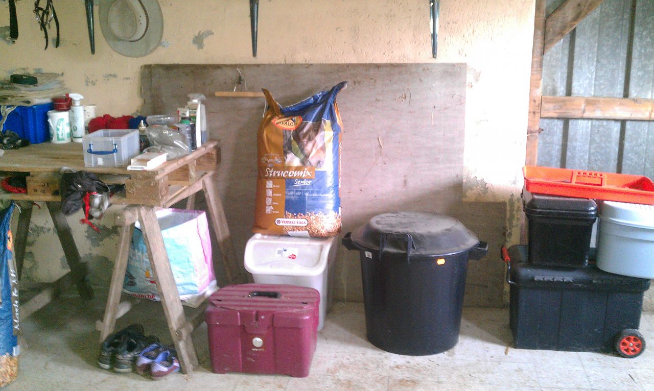| Dire merci | je squatte un bout de mon garage pour la sellerie (une bonne moitié, entre les selles, les accessoires, les filets et les floconnés...) j'ai récupéré une armoire que j'ai mis sur des roulettes, dans la partie à étages, j'ai mis les bandes, les protections de travail et les fly mask. Dans la paetie penderie, j'ai mis des clous un peu partout dedans et j'ai accroché les licols plats et les longes. sur la porte de la penderie, également des clous où j'ai accroché des filets et les licols ethologiques. j'ai acheté 2 étagères en plastiques vites montées, pas chères et bien pratiques pour mettre les tapis de selle western et classiques, les couvertures (imper, doublées polaire, séchantes, doudounes et couvre.reins) les boites de pansage, les protections de transport, les compléments alimentaires et la tondeuse. J'ai fait 2 caisses, une avec les produits d'entretien, l'autre avec les médicaments et les affaires de pharmacie. devant ces armoires, j'ai posé des chevalets achetés l'équivalent de 3€ pièce pour les selles classiques et western. et devant, contre la porte de garage, les floconnés, mash, sacs de lin et de son, ainsi que les sacs de pain, sur une palette. ![]() Message édité le 14/12/11 à 22:55 |