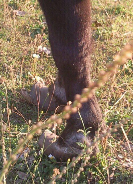 | Dire merci | soumets ce cas -et cette photo- à des personnes expérimentées, car si je vois là des sabots longs, je ne suis pas sûr de voir les pieds d'un animal en grande souffrance |