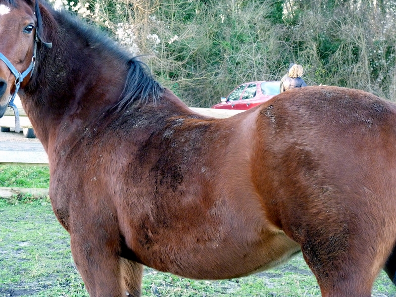 | Dire merci | Gros plan sur le dos de la jument devant la cloture; jument n'ayant même pas 10 ans mais un dos massacré en plus d'être grasse comme un cochon et probablement en train de préparer un diabète de type 2 avec ce régime alimentaire criminel parce que c'est exactement de cela qu'il s'agit. ![]() |