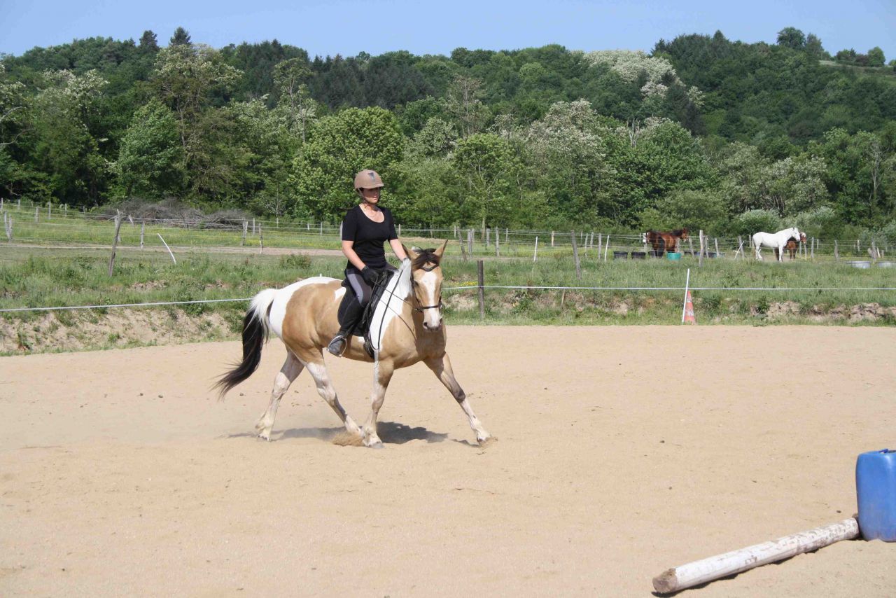 | Dire merci | J'ai une croisée Lusi-psar-angloar. Mais je suspecte un apport de sang QH chez le papa. Elle a 7 ans. Elle fait un peu de tout mais principalement de l'extérieur et du pré! Elle est émotive, réactive, un peu sur l'oeil, a un caractère parfois grincheux, a du jus, peut monter en pression mais descendre aussi très vite (presque à la demande). Elle prévisible au possible ce qui me la rend vraiment fiable car je la connais vraiment bien. Morphologiquement, elle n'est pas "idéale", mentalement non plus, mais je ne la changerai pour rien au monde. Depuis quand on échange des membres de sa famille d'ailleurs??? ![]() alors une petite photo du modèle (1m50 peut être 52 maintenant). ![]() une autre en mouvement: ![]() |