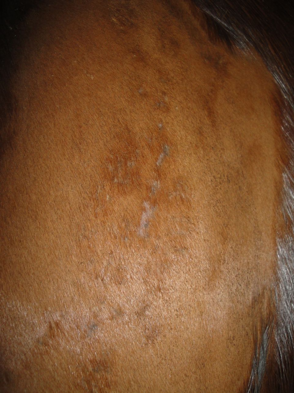 | Dire merci | Bonsoir, alors voila mon cheval a des genres de boutons sur la fesse droite en longueur. Ca fait depuis début mai qu'il a ça... le veto est venu et pensait que c'était la teigne mais le traitement n'a fait aucun effet donc ce n'est pas un champignon... Ensuite il est revenu examiné et pense maintenant que ce serait un staphylocoque. On lui met de l'hexomedine transcutanée matin et soir. Si il n'y a aucun effet, il penchera pour le staphylocoque doré... donc avant qu'il ait des antibio il va faire des prélèvement et analyse. ![]() |