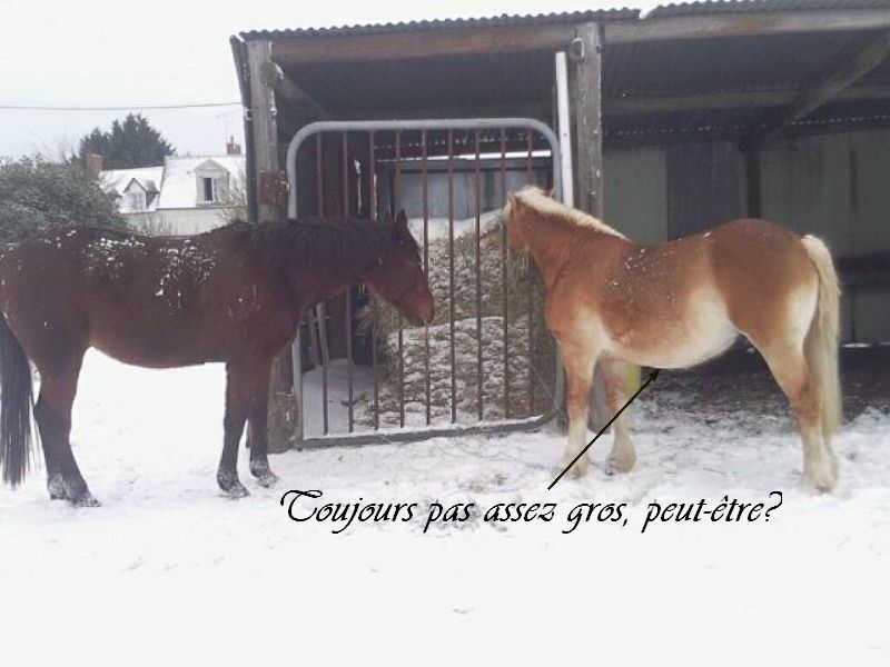 | Dire merci | Poney haflinger qui passe sa vie au pré & qui a été au box entre novembre et décembre exceptionnellement, puis re au pré depuis le 20 décembre. Il est avec un copain qui lui ressemble à un gros nounours avec un poil épais, alors que poney lui, a un poil qui paraît comme celui d'été... (j'ai l'impression) Normal ou pas? Il n'a pas de couverture permanente, juste une séchante qu'il n'a portée qu'une fois quelques minutes pour l'instant. Donc par ce temps, que dois-je faire? Il n'a pas l'air mal, mais bon... y a t il une astuce pour favoriser la pousse de poils? D'avance, merci ![]() |