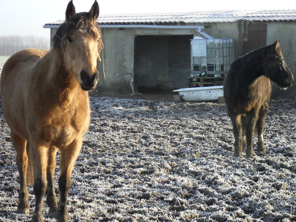 | Dire merci | 3 chevaux sur 6000m2, avec abri fermé sur 2 cotés et foin à volonté + poignée de granulés pour les 2premiers, et 2 rations consistantes pour la dernière. 1 jument haflinger de 13 ans, jamais couverte, bien en état. 1 hongre type espagnol*arabe, 14ans, jamais couvert, bien en état. 1 jument haflinger, 28ans. Elle a sa première couverture depuis mercredi, une 300g imperméable. Elle avait bcp perdu d'état l'hiver passé. Pour éviter que ça ne recommence, elle a été complémenté tôt cette saison, les jours froids. Mais là, les températures ont vraiment chuté, et tant qu'on ne passera pas au dessus des -10 la journée, on lui laissera. On a des -20 la nuit, et elle a vraiment souffert du froid mardi. De plus, elle a les pieds très sensibles et sur sol gelé, elle évite de se déplacer, du coup, elle se réchauffe moins. Ils annoncent encore 1,5semaines de froid comme ça je crois, on verra après. Le but étant de la couvrir le moins possible. |