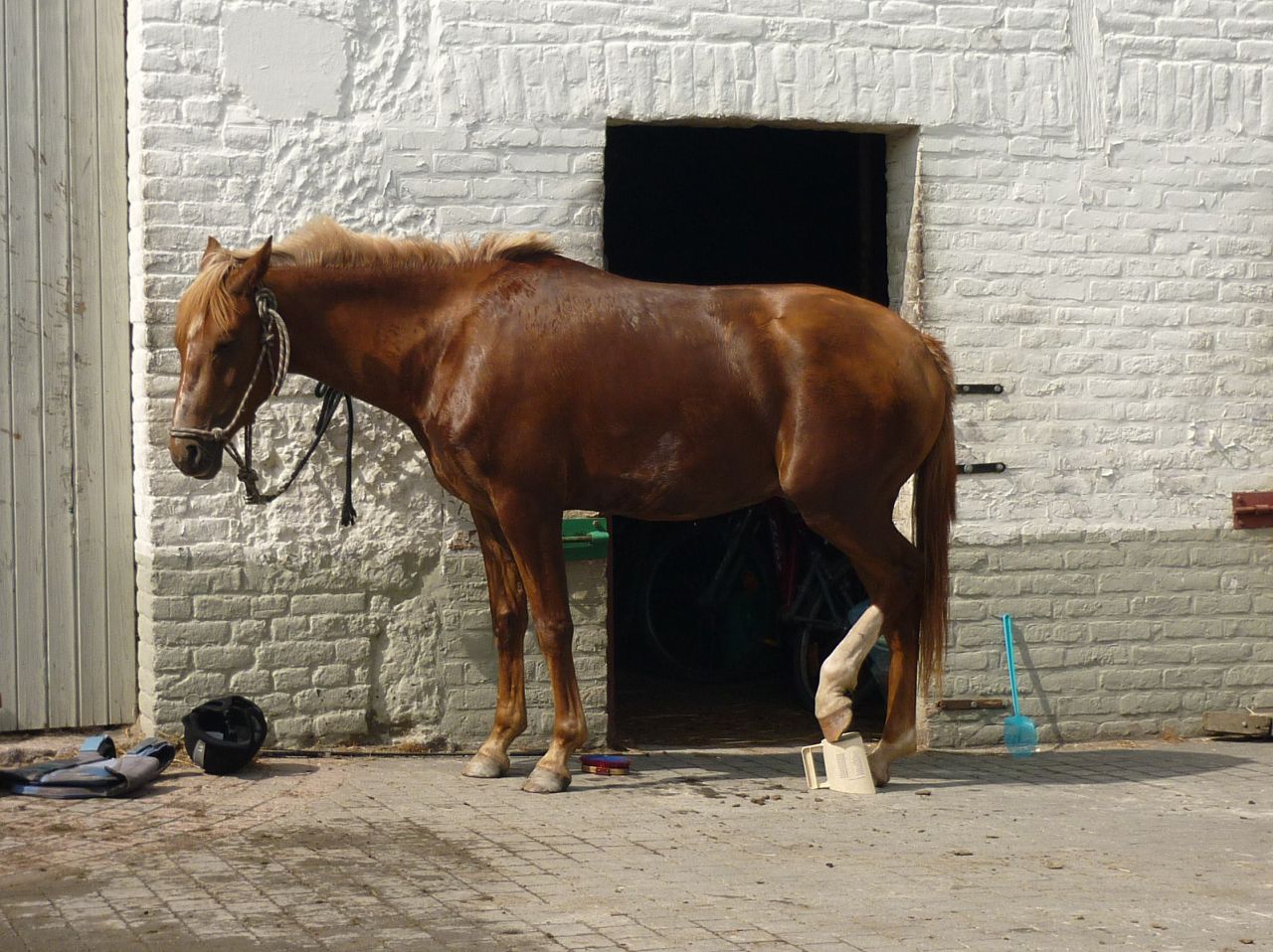 | Dire merci | J'ai testé pour vous .. Le cheval qui avait besoin d'un appuis sous son pied ! (Et juré, il a fait ça tout seul ! quelqu'un avait juste laissé ça trainer .. ) |