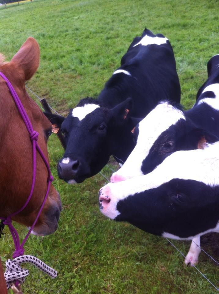 | Dire merci | à croire que les vaches ont jamais vu un cheval !!!! (c'est peut être vrai n'empêche elles ont pas l'air vieilles) |
