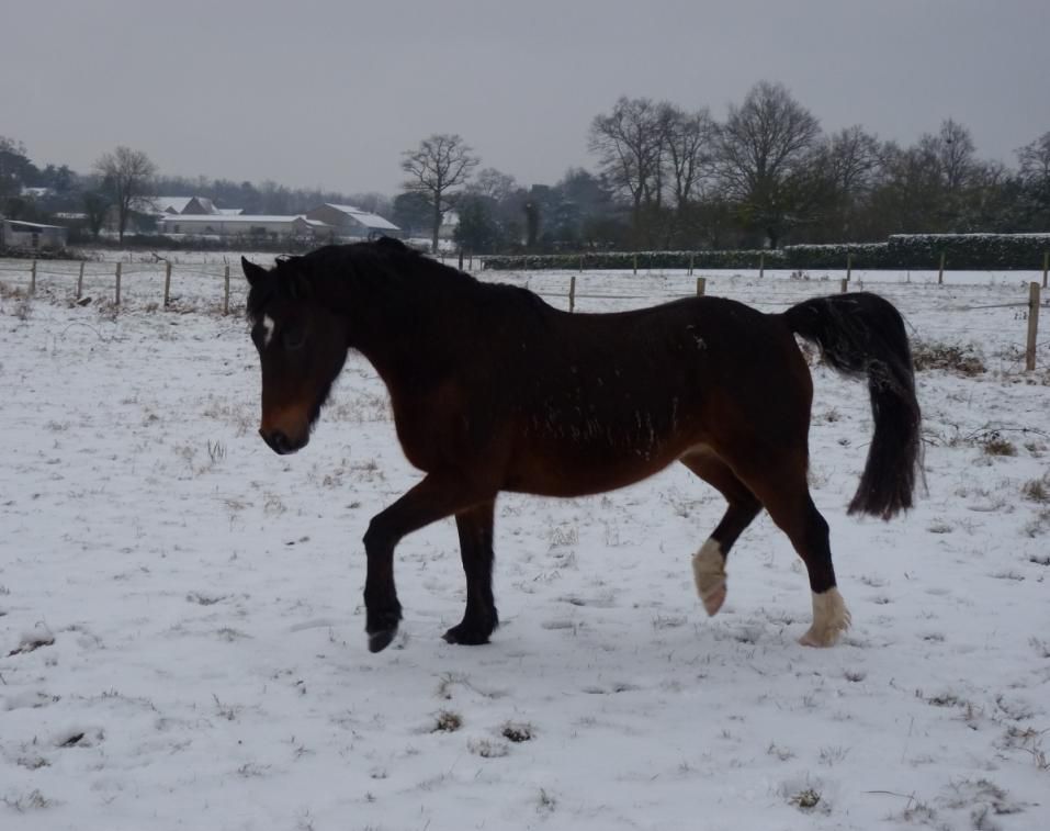 | Dire merci | Jivago, poney de 1m36 par un connemara et une petite ponette fait un peu de tout à la maison (étho, travail en liberté, saut, dressage, balade, cordelette ) sort en concours de cso et en endurance vit au pré toute l'année une petite photo de y a 2 semaines dans la neige ![]() |