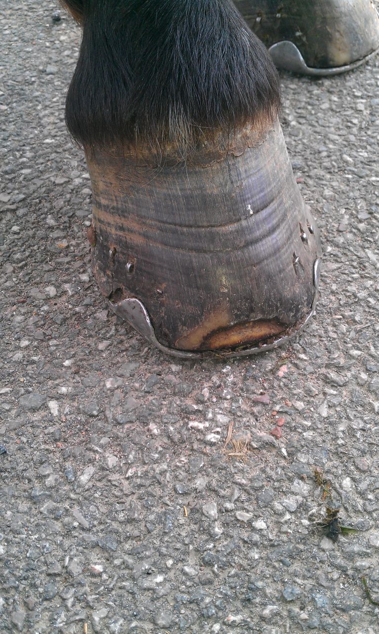 | Dire merci | Un début de cochonnerie, la ligne blanche ( si c'est bien elle, j'ai du mal a me rendre compte de la profondeur du truc) est bien noire...et loi de la moindre résistance, c'est parti en éclat... L'avantage du pied de trois kilometres dans ce cas là, c'est que le maréchal va pouvoir enlever beaucoup avant que ça devienne problématique pour le cheval. |