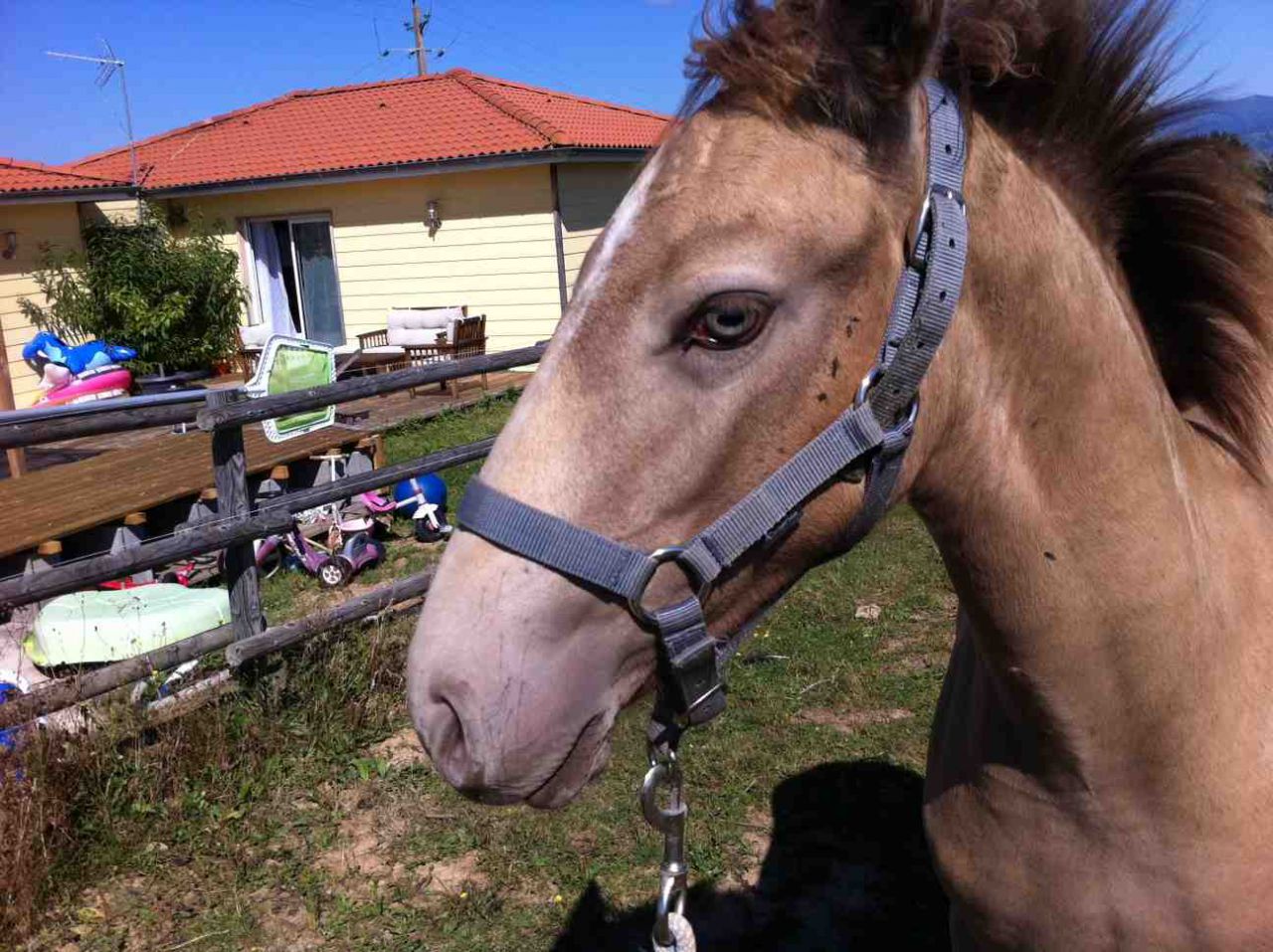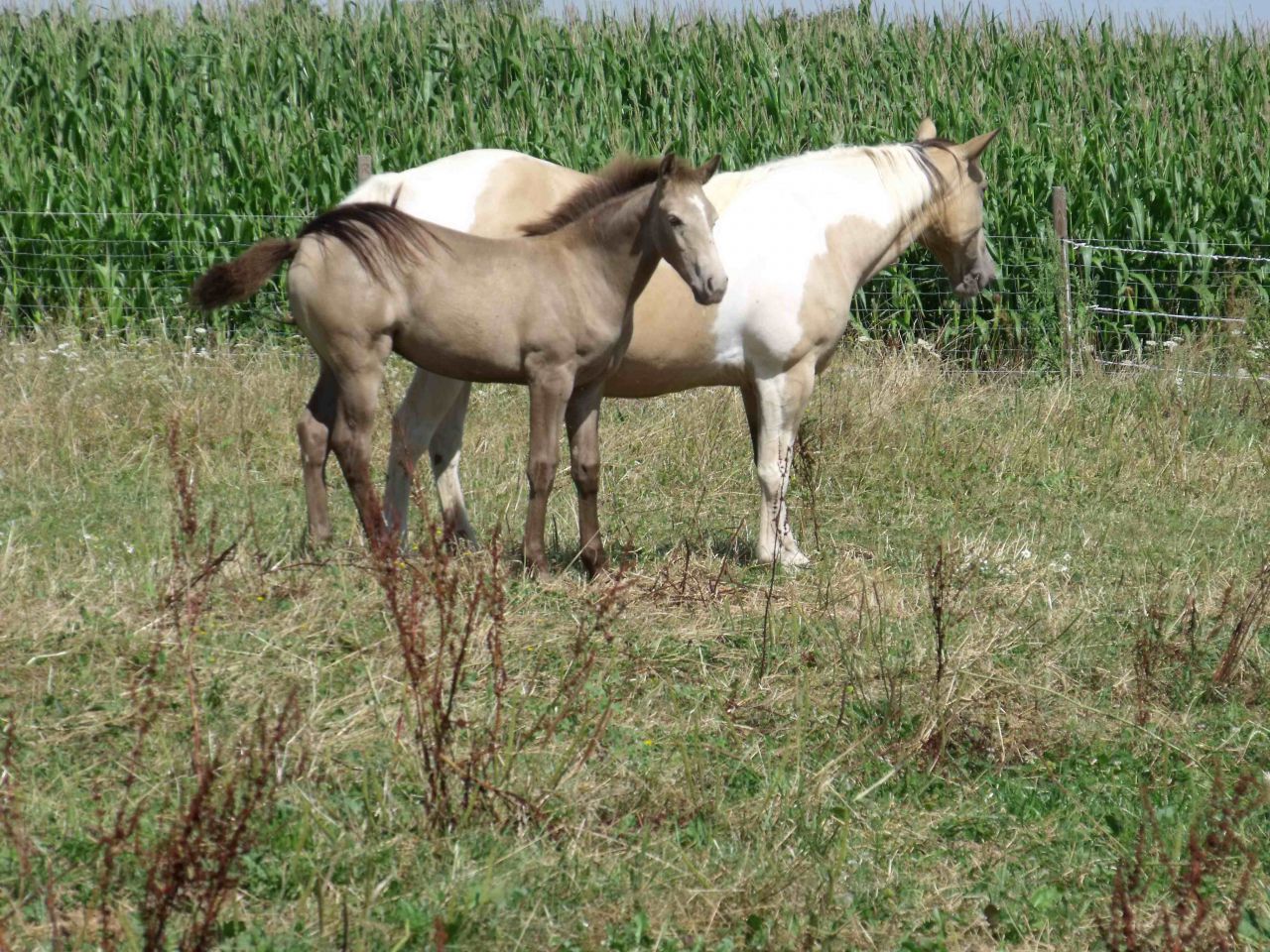 | Dire merci | Alors niveau caractère..................... Elle est super, peur de rien (contrairement à sa mère) très sociable et surtout respectueuse (bon pas toujours des clôtures quand on la sépare de maman). Elle apprend super vite et pige très vite aussi quand elle a fait une bétise... elle a passé avec succés les épreuves longe au pas et au trot sans maman, les sorties en passant devant, derrière, le marchal, l'ostéo, la douche et l'attache longtemps.Oui je l'ai fait testé. Elle a un gène champagne, un crème et aussi un gris. Pour les photos, promis j'en refais mais des plus jolies car j'ai honte de celle ci, mais toute seule, avec un pot de colle, pas simple du tout ! |