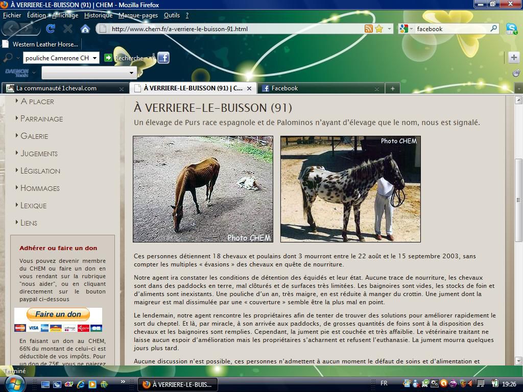 | Dire merci | ce n'est pas faux thalis ! mais pour qu'ils aient été signalé au CHEM, c'est qu'il y avait sans doute un soucis les assos sont parfois abusives, ok, mais là, ya eu mort de chevaux ! c'est pas rien ! et pour la photo que tu montres "et là personne fait rien...." et bah, ce n'est pas normal non plus !! voir si c'est un vieux cheval et si il a a manger et à boire, mais sinon, c'est aussi un cheval à signaler ! |