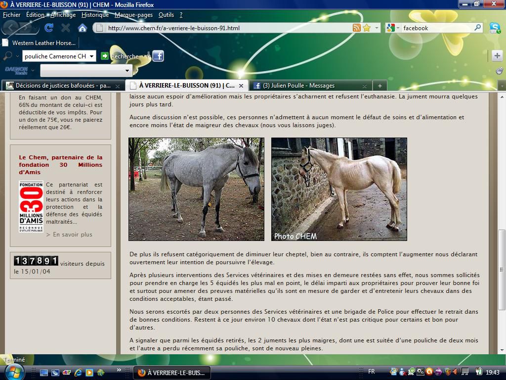 DéconnectéDire merci | Elfe, mon avis n'est pas que le mien, il y aurait des hébergistes aussi qui ne seraient plus pour le CHEM ..car ils ont eu ordre d'arrêter les soins et donc les frais sur les chevaux. Voilez vous la face si vous le voulez et continuez à écrire des ignominies et des médisances puisque vous connaissez mieux l'affaire que moi même ! Pour info, il y avait 18 chevaux, 5 étaient maigres car ils étaient malades. Relisez ce qu'à dit le Juge et les multiples juges : "Il n'y a pas eu maltraitance !" Des chevaux parés, soignés, vermifugés, alimentés, soignés et vus 3 fois par jour ne sont pas maltraités ni physiquement, ni psychologiquement... et puis des photos prises de haut et avant que les chevaux reprennent du poids ...ne veulent rien, .. Vous ne savez pas réellement comment étaient les chevaux à l'enlèvement et comment il s'est passé ! Mais peu importe vous ne voulez pas savoir : "une pouliche en état avant leur arrivée, shoutée et embarquée à coups de pieds et à coups de balai" c'est véridique, mais peut être que vous ne pourriez pas en croire vos yeux .. pourtant c'est embarquement CHEM" |