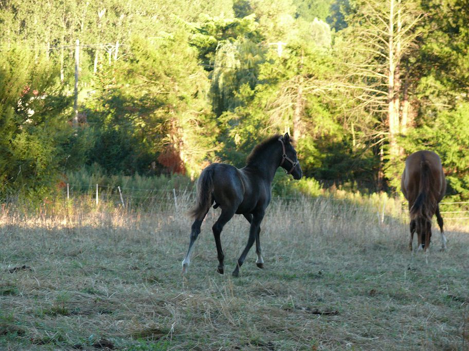 | Dire merci | Viens juste de voir ton post, ce petit père est très mignon, et pour info (car les Hn ne sont pas toujour bien informés sur les couleurs de robes), il est Smocky Black, c'ets à dire: Noir + 1 alèlle Crème. contrairement à l'isabelle qui a une robe de base baie, le smocky black a une robe de base noire, il est très souvent confondu avec du noir ou bai foncé. Et pour les yeux bleus à sa naissance c’est une particularité de sa robe, les chevaux smocky blacks naissent avec des yeux clairs (bleus ou gris), mais les yeux s'assombrissent quand il sont encore poulains. Message édité le 04/10/12 à 22:19 |