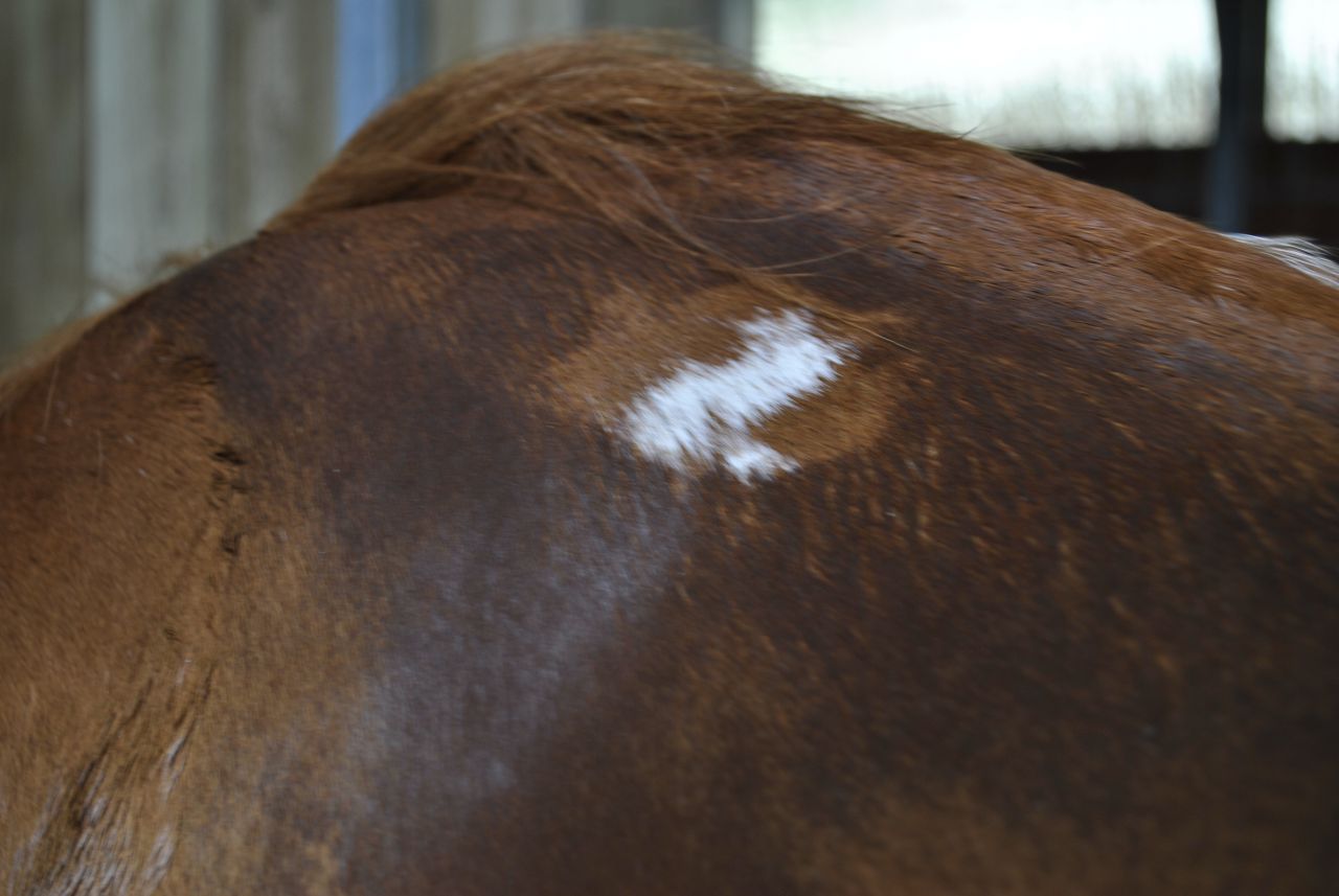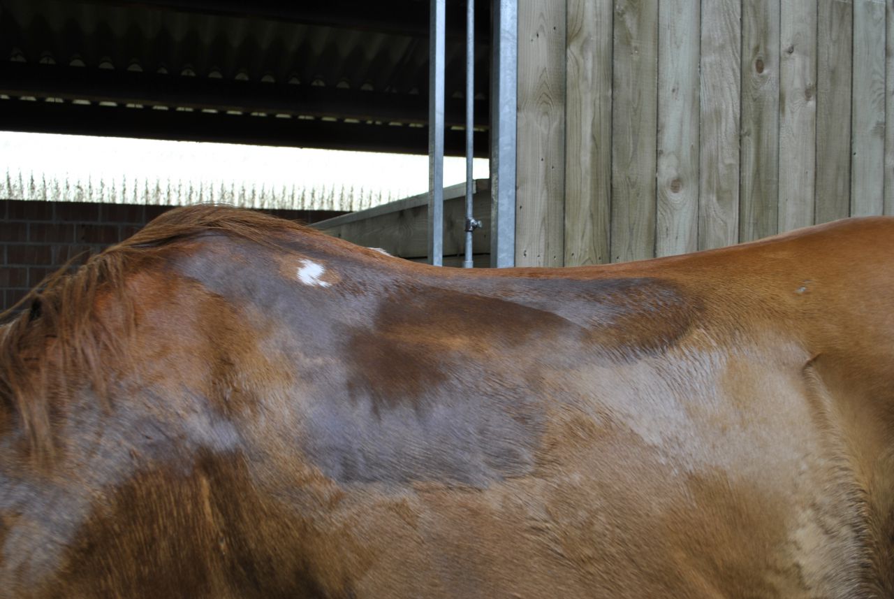 | Dire merci | Les traces ne sont pas de la même taille du tout, ni de la même forme, mais au même endroit de chaque côté... et aussi, elles sont identiques aux traces d'il y a 5 ans, alors que tapis et selle différents... |