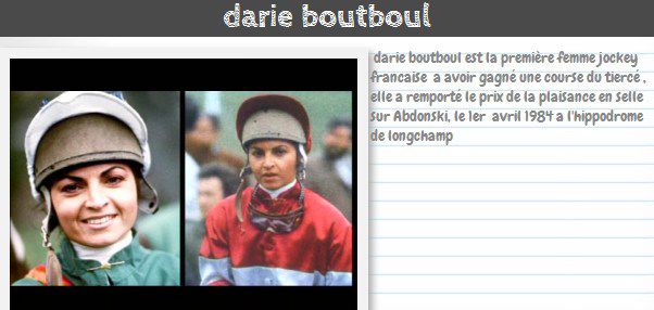 | Dire merci | il me semble qu'il ya des femmes jockeys, te dire les noms je ne sais pas, mais yen a en France c'est sur ![]() |
