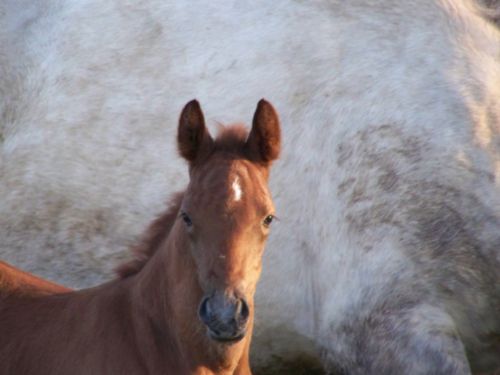 | Dire merci | la première mue de mon gros, né alezan assez clair et maintenant (4 ans) alezan brûlé il a 3 mois sur cette photo mais arborait un "loup" alezan brûlé autour des yeux dès ses 1 mois 1/2 |