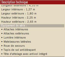 | Dire merci | On va pas dire que j'ai eu le choix car je suis tombée sur une super occaz. Mais sinon je l'adore mon Fautras et je suis pas prête d'en changer. Le ++ : Le plancher surbaissé, la sellerie, la lumière à l'intérieur, les différents points d'attache dehors, le crochet qui retient la porte arrière. Le -- : Pas de poignée pour manoeuvrer mais j'ai trouvé une astuce : je remonte la roue jockey à fond ce qui fait que le van n'est plus que sur 1 essieu et est beaucoup facile à bouger. |
