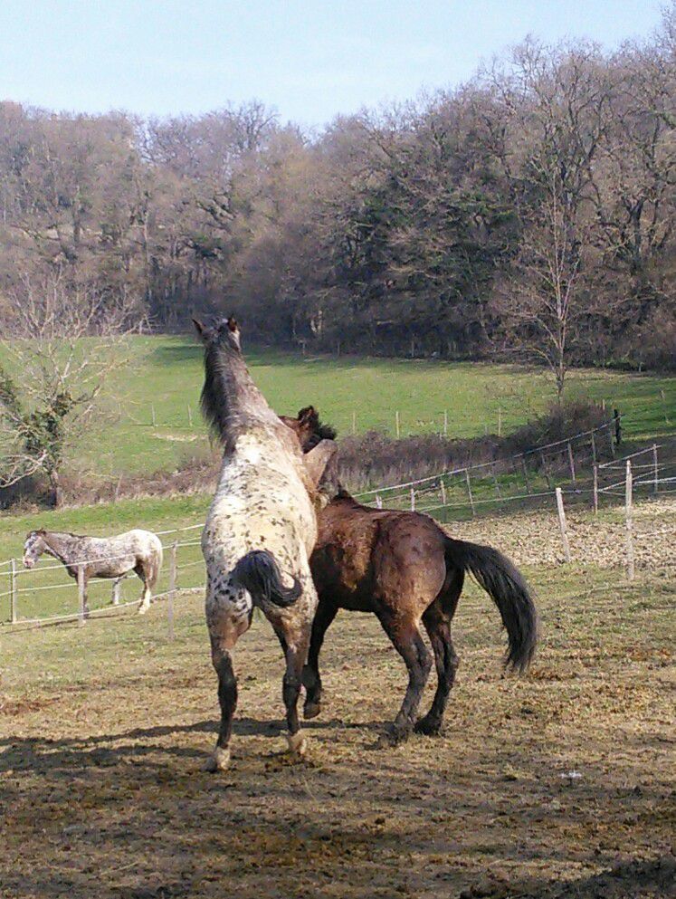 | Dire merci | Je profite de ce post pour savoir si vous aussi vos poulains sont en ce moment tout le temps à jouer à se battre ? (Enfin pour les mâles plutôt). Mon petit Declik de 21mois est avec le poulain d'une amie de 23 mois et leurs maman (ils ont été sevrés puis remis ensemble), et en ce moment ils passent leur temps à se battre. Je ne sais pas si c'est propre à leur âge et qu'ils vont se calmer ensuite ? Une petite photo pour illustrer : ![]() |