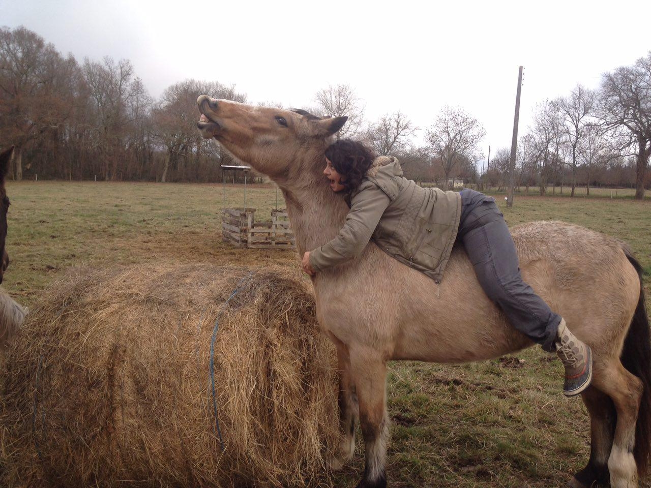 | Dire merci | ici, nous on fait pas grand chose a part des gratouilles , quelques jeux, pour preparer la jambette et la reverence... je lui met des enfants sur le dos a cru, et on fait quelques pas, "c'est etrange, ça bouge la dessus quand je marche"... elle est cool et toujours tres curieuse, ça a ete la premiere a s'avancer vers le bouc lorsqu'on l'a amené dans le pré des chevaux pour une petite rencontre du 3eme type, du coup on lui montre des bouc chevres beliers moutons poules... |