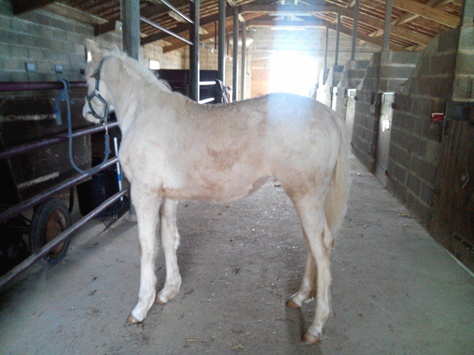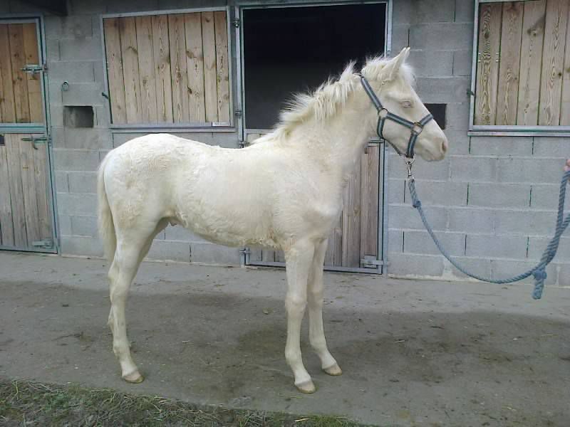 | Dire merci | des nouvelles de Diamant qui après presque 2 mois séparé de la mère et rentré à l'écurie il est toujours avec son papy dans un pré pas mitoyen avec sa mère ils se sont entendu mais pas appelés ni cherché bref le top ! il a fêté ses 7 mois il vit dehors, mais en ce moment il pleut tellement souvent qu'il arrive que je le rentre un peu au box, ça lui apprend aussi à se séparer du copain, et à se geré seul il est extra manipulé tien à l'attache gentil, très respectueux (il n'a pas le choix !!! ) et très sanguin ! j'ai eu (enfin !) les résultat du test de coloration il est donc * cr/cr = homozygote sur le crème * ee/ee = homozygote sur l'alezan * AA/AA = non porteur de l'allèle noir [url=https://www.1cheval.com/membre/services/photos/images/174832.jpg] ![]() |