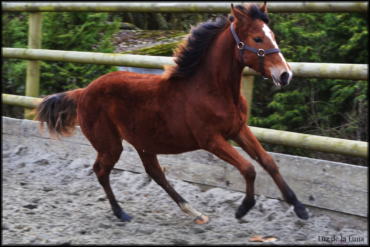 | Dire merci | Lien Delwin, 6mois et demi sur la vidéo. Avec ma V, sa demi-sœur par la mère, dans la carrière détrempée... J'aimerais vraiment la garder celle-là. Et elle a un coup de saut impressionnant ! Par contre on ne bosse pas du tout nous ! Elle voit le maréchal toutes les 7 semaines, n'a pas bougé aux vaccins, adore le pansage. Comme je n'ai besoin de rien d'autre, on se contente des câlins tous les jours. C'est toujours la première arrivée au galop quand je rentre dans le pré ! Sevrage prévu prochainement. Je souhaitais attendre mais la mère commence à décoller... |
