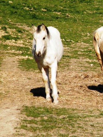 | Dire merci | Oups c'est vrai j'ai omis de préciser son nom et origines :Elle s'appelle Buxie ( va savoir pourquoi l'éleveuse ne l'a pas mise à la lettre ! pas obligatoire mais c'est dommage ), son père est pur sang arabe de robe bai sabino et sa mère 1/4 arabe et 3/4 quarter de robe crème. |