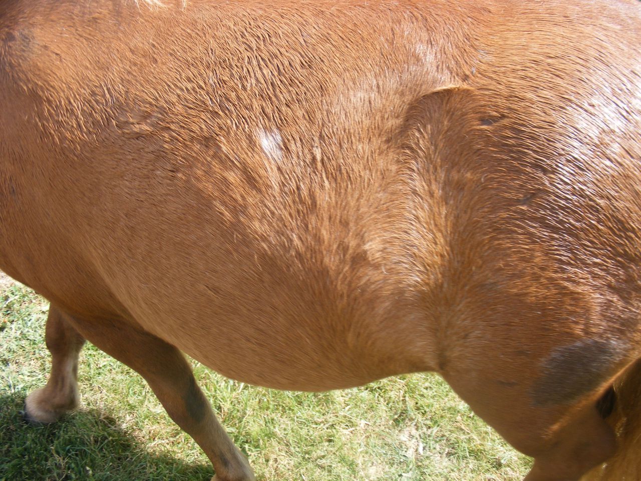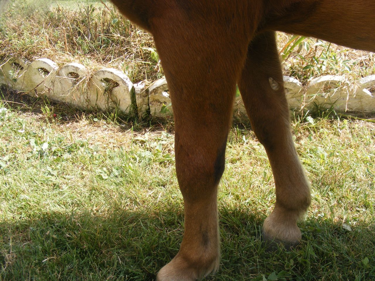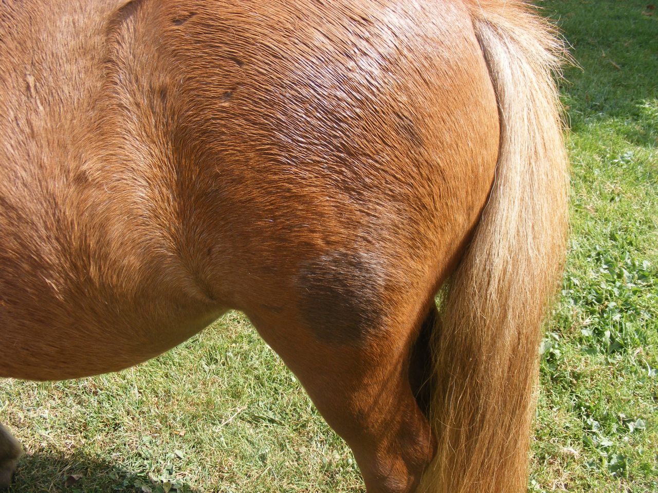 | Dire merci | les taches brunes plus foncées sont des charbonures, c'est courant chez les alezans. Ca n'a rien à voir avec des pommelures. |