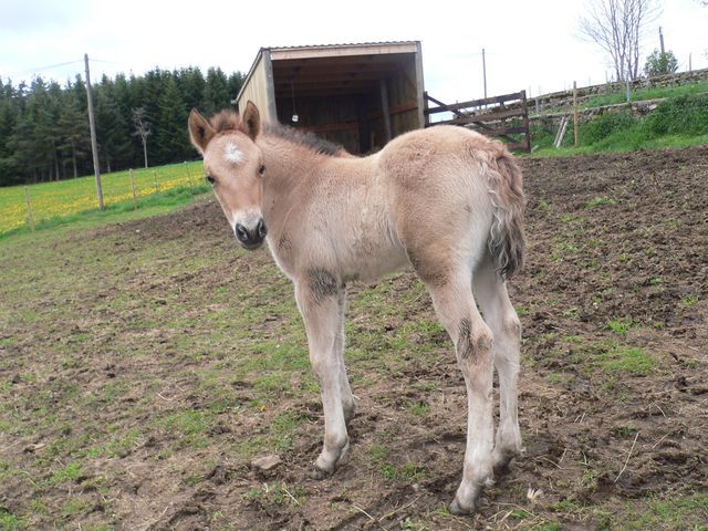 | Dire merci | A 6 mois, ma pouliche n'avait toujours pas les marques noires ![]() Et avec une maman fjord, le poulain aura forcément une robe diluée par le gène dun. Après, sans connaître la robe du père, c'est difficile à dire... J'aurais aussi dit dun et crème sur base bai. |