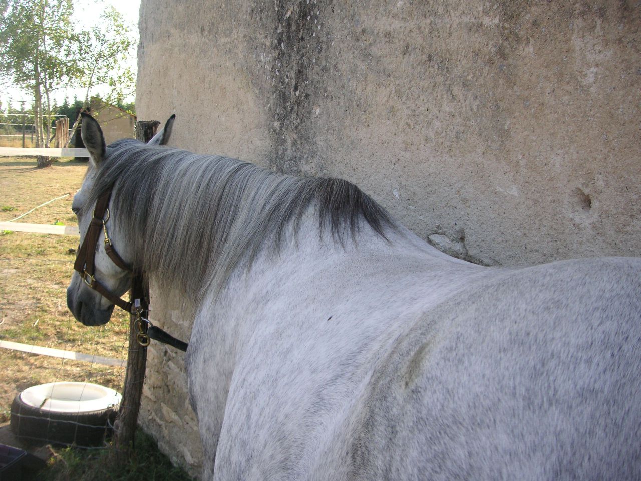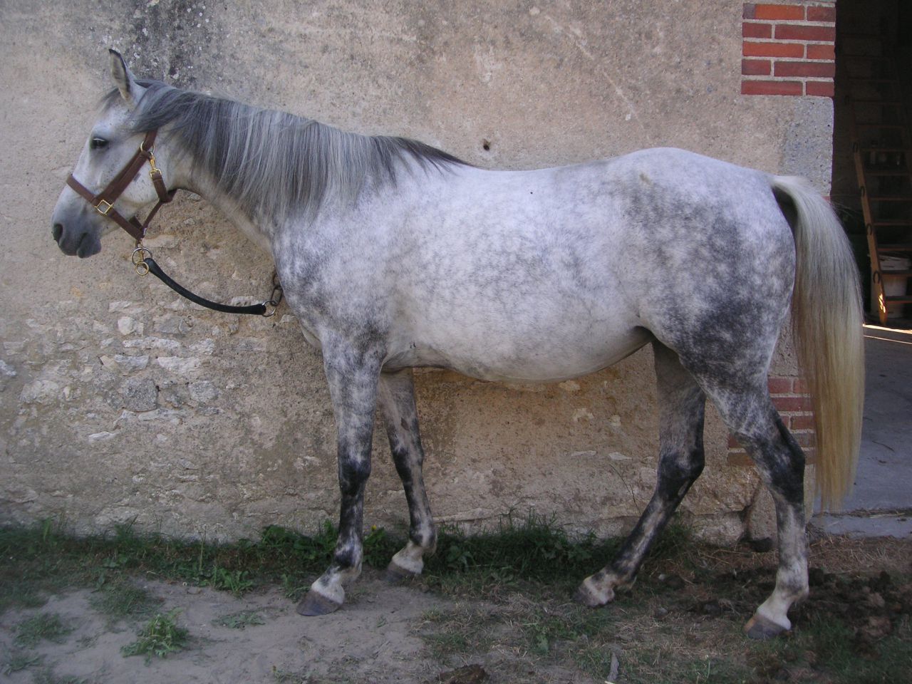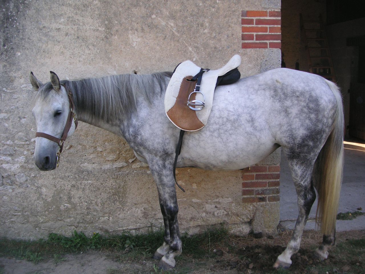 | Dire merci | Je suis l'heureuse propriétaire de ma jument Paloma depuis le mois de janvier. C'est une petite (1m52) jument hispano-arabe de 9ans, débourrée également en début d'année. Je l'ai faite saillir au mois de juin par un DSA palomino (poulichou attendu pour le mois de mai). J'aimerais reprendre des petites ballades tranquilles à partir du mois de septembre.....mais probleme....je n'ai pas de selle qui lui vont...... Elle est ronde comme un tonneau (même sans être pleine), un dos très large et un garrot noyé dans la masse (genre gros poney quoi). Du coup la selle glisse au montoir, et dans les changements de direction... |
