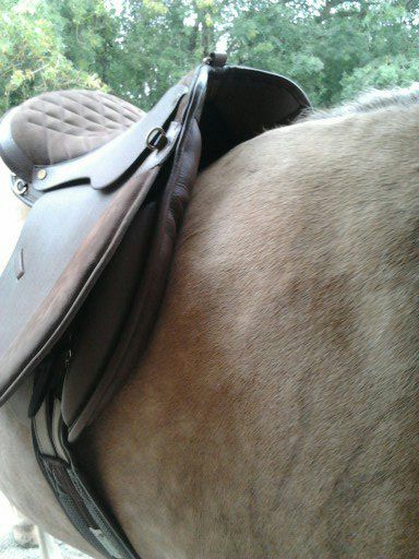 | Dire merci | Bon, j'ai toujours pas reçu mon arcade blanche..... Par contre hier petite séance sur le plat avec ma mémère. J'ai mis ma devoucoux... de mon coté je suis hyper bien dessus, mais la selle a tendance à avancer et à tourner un peu...et je peux pas fixer de croupiere dessus, meme avec le "T" que j'avais commandé. et les traces de transpiration sont pas du tout uniformes (traces au niveau des épaules, de la sangle et des quartiers....mais rien au niveau du dos!). Bref je suis bien déçue, surtout que le poulain a naitre va être à quelques choses pres, du même gabarit (j'ai choisi un étalon avec un modele proche de celui de ma jument). Je pense que je vais vendre à court terme ma devoucoux. j'espere que la wintec va aller avec la nouvelle arcarde.... |