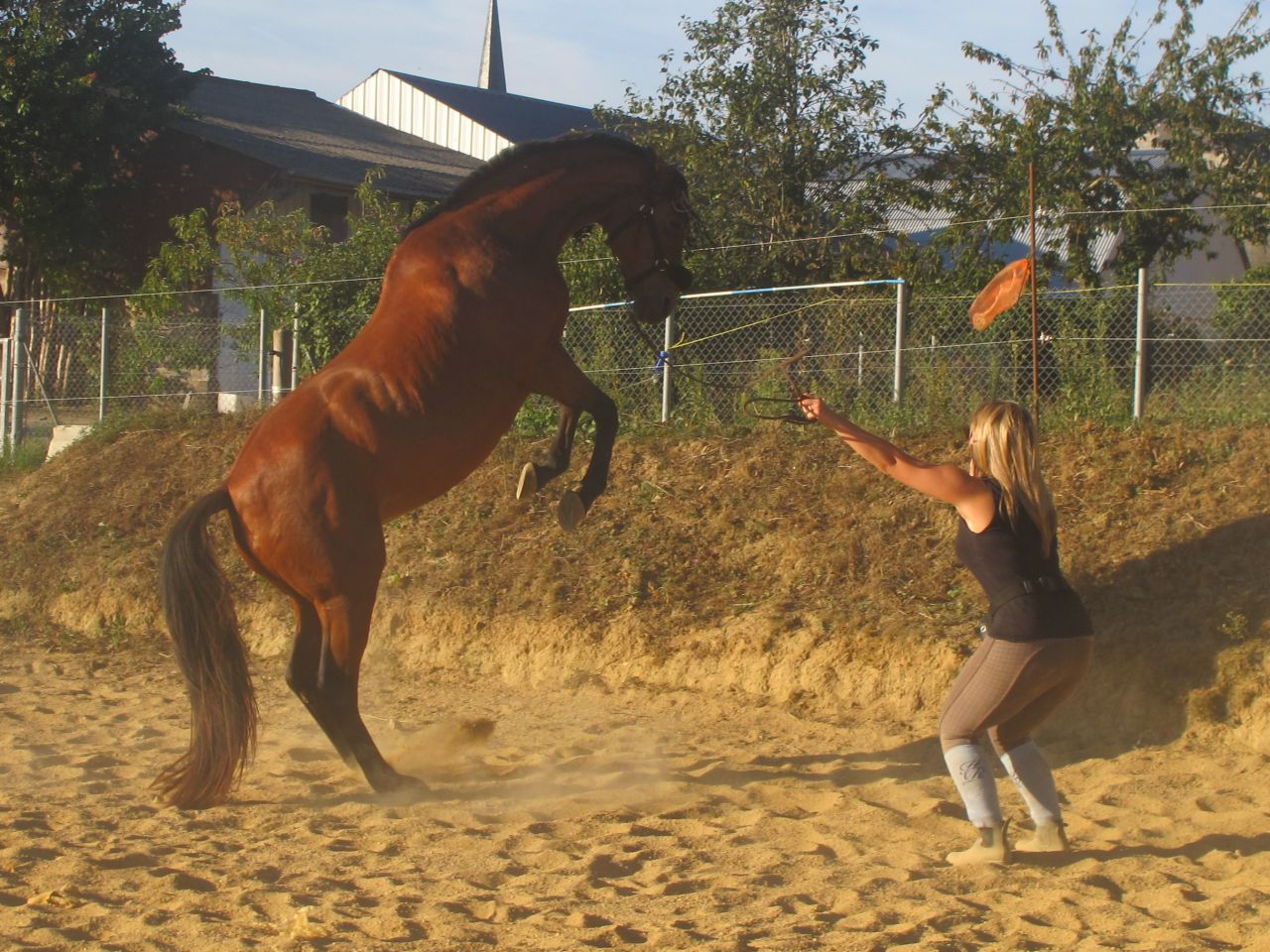 | Dire merci | Faudrait voir comment elle fait ses cabres, mais vu la photo, c'est fait sur une longe courte, de côté par rapport à la jument et dans une position déjà de sécurité/recul de la personne qui marque quand même une mise sur la défensive/fuite par rapport à l'exercice demandé... Dès lors déjà prendre une vraie longe aussi pour pouvoir renvoyer le cheval et surtout mettre de la distance sans avoir à bouger... |