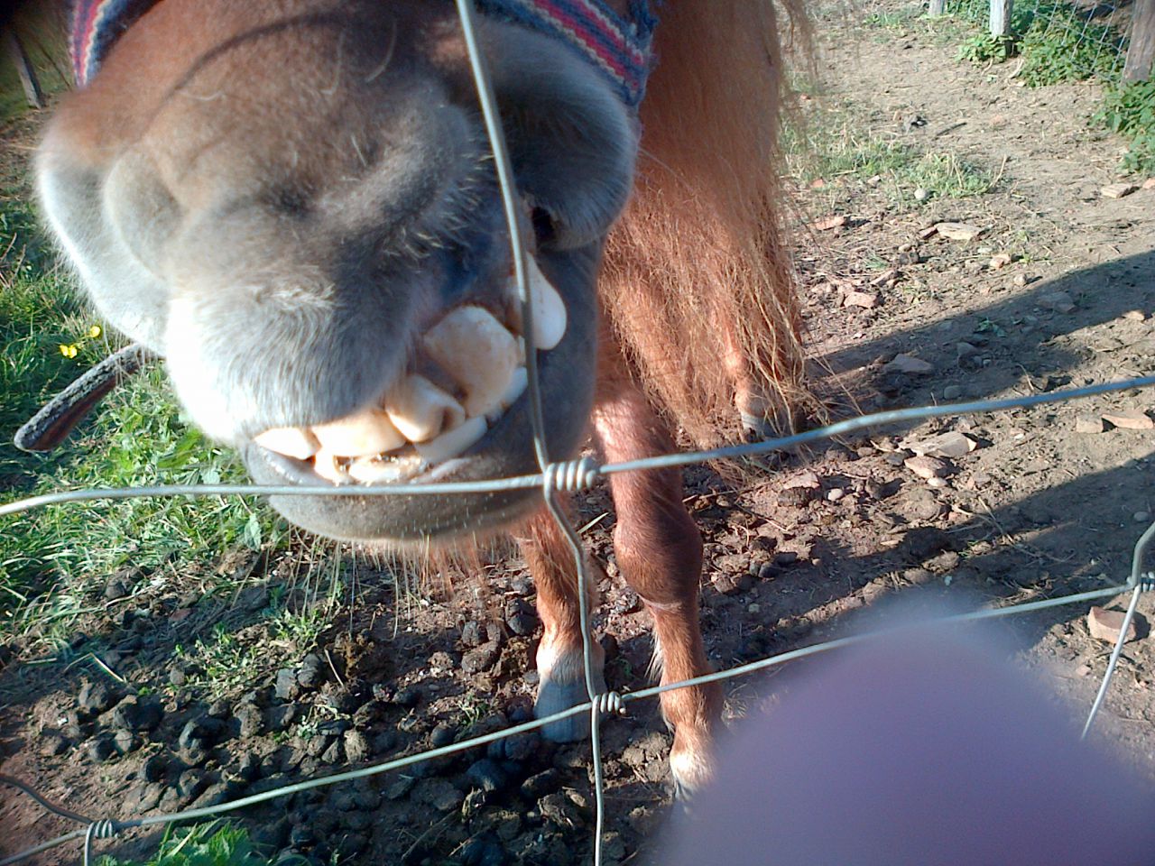 | Dire merci | sur la photo précedente, il avait moins d'un an. J'ai l'impression que maintenant, cela se voit moins de l'extérieur mais le décalage des dents est toujours aussi important. Les gens que je croise ne le remarque pas. Mon cheval a maintenant 5 ans et je le monte au licol ou avec un filet bitless. |