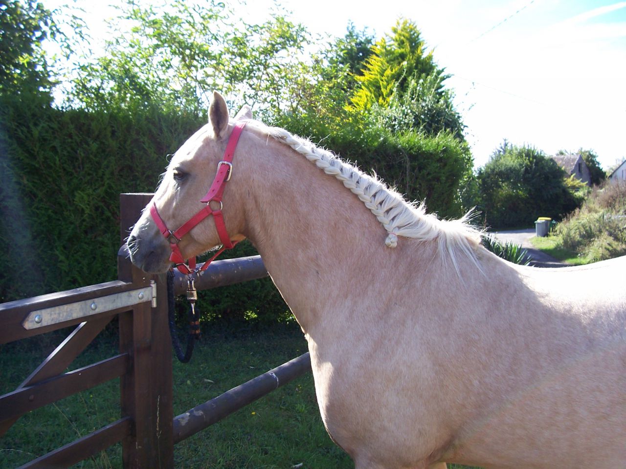 | Dire merci | Pour l'instant je n'ai qu'une photo où on voit un peu sa crinière, on était en train d'attendre pour passer donc un peu stress (enfin moi, lui c'était le zen incarné sur le salon!) :![]() On ne voit pas très bien mais il a trois rubans rouges dans la crinière, pour faire un rappel avec le motif de ma cape (là c'était mal fait, c'était le dimanche et Vahiquo était plus là!). Et j'ai fait une tresse de toupet "épi de blé", j'aime bien cette forme (tresse à deux brins). |