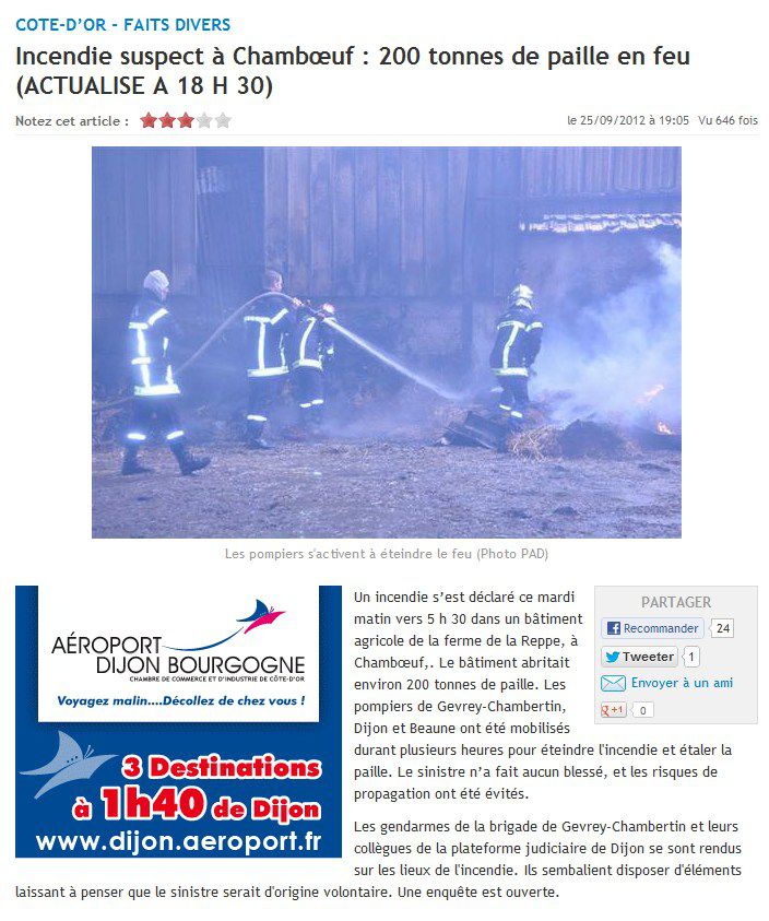| Dire merci | Ici en Alsace, au centre équestre de ma ville, leur "bulle" à foin/paille a aussi brûlé la semaine dernière, pour la deuxième fois en 3 ans ! Pauvres chevaux, heureusement, pas de dégâts Equins, mais voilà, plus de paille plus de foin ! |