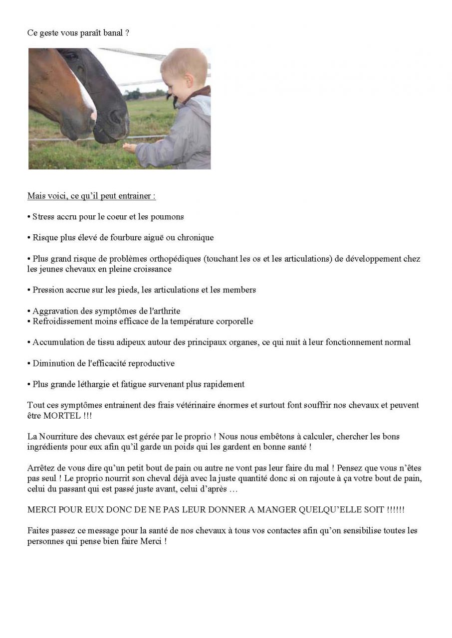 | Dire merci | oui comme "mystic2" une affiche clair et net ! Trop long, personne ne le lira, moi la premiére Je comprend que sa te mette en colére, moi quand les petits donnes des poches de pain a longueur de journée au chevaux, sa m'énerve et du coup faut surveillé et faire la police en leur expliquant que c'est un cheval de proprio et qu'il ne faut pas donné n'inporte quoi. |
