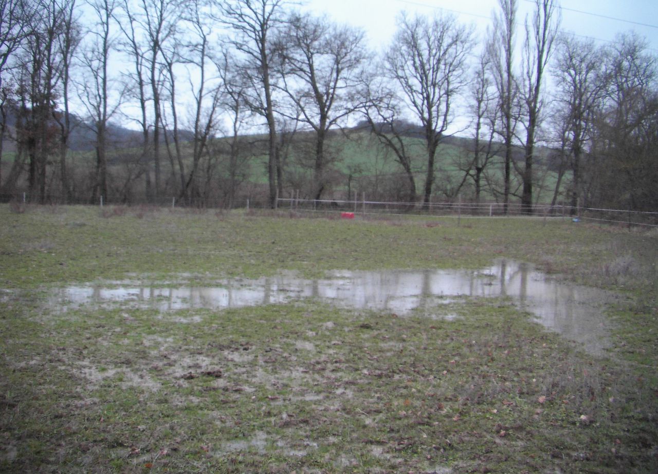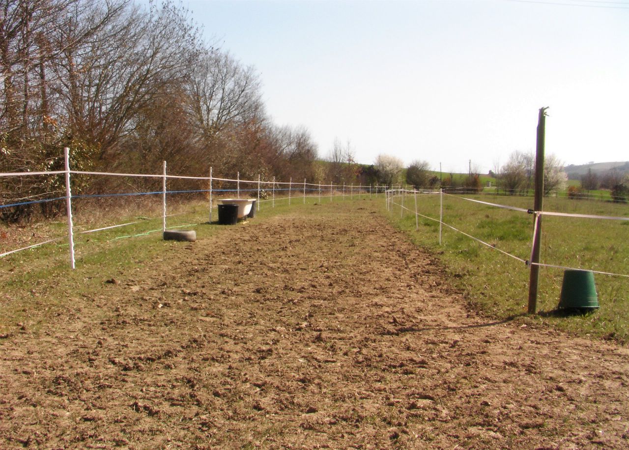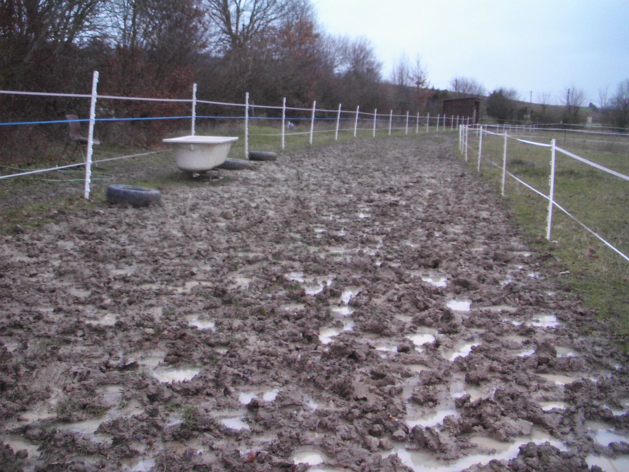 | Dire merci | Merci beaucoup pour ce sujet, que j'ai lu avec attention, puisque moi aussi j'ai deux chevaux (et j'en garde un troisième) au pré et à côté de la maison. Je loue un pré d'à peu près 2,5 ha que j'ai transformé en "paddock paradise" avec 5 parcelles que j'ouvre l'une après l'autre pendant 15 jours, le tout entouré d'un "couloir" ouvert tout le temps et où j'ai mis le point d'eau (une baignoire), l'abri (6x3m) et un rond de longe, chacun dans un coin différent. Tout ça semble idéal, mais vu qu'il pleut depuis 1 mois et demi, le couloir s'est transformé en champ de bataille boueux, l'abri idem car pas d'auvent, et les chevaux pataugent. D'où ma recherche sur la gestion des pâtures... D'abord, un peu de photos pour aider à se rendre compte: le plan (en rouge la clôture extérieure et en jaune les clôtures intérieures. Ça en fait des piquets et du ruban électrique): ![]() (la grande prairie, c'est un pré de fauche à côté, que l'agriculteur me prête quelquefois en février, comme cette année, mais cette année, c'est beaucoup trop mou :cry ![]() l'abri (quand il faisait beau...): ![]() le coin "eau" (l'abri est maintenant au bout de ce couloir): ![]() le couloir qui descend (vers une petite rivière), vu de l'abri: ![]() et une vue d'en haut encore, qui montre les limites entre parcelles et le "triangle" dans lequel on a maintenant installé le rond de longe: ![]() Et pour se rendre compte encore, des photos de maintenant, avec la boue et les mares (le terrain est argileux): le triangle avec le rond de longe au fond: ![]() le coin "eau" (avec les pneus pour caler les seaux d'orge-carotte du matin et du soir): ![]() l'abri :![]() Voilà le problème. Alors, à vous lire, il semble qu'il vaille mieux sacrifier un morceau de pâture pour l'hiver, et puis surtout, LN, peux-tu nous donner une idée des meilleurs prix des dalles pour stabiliser le sol ? |