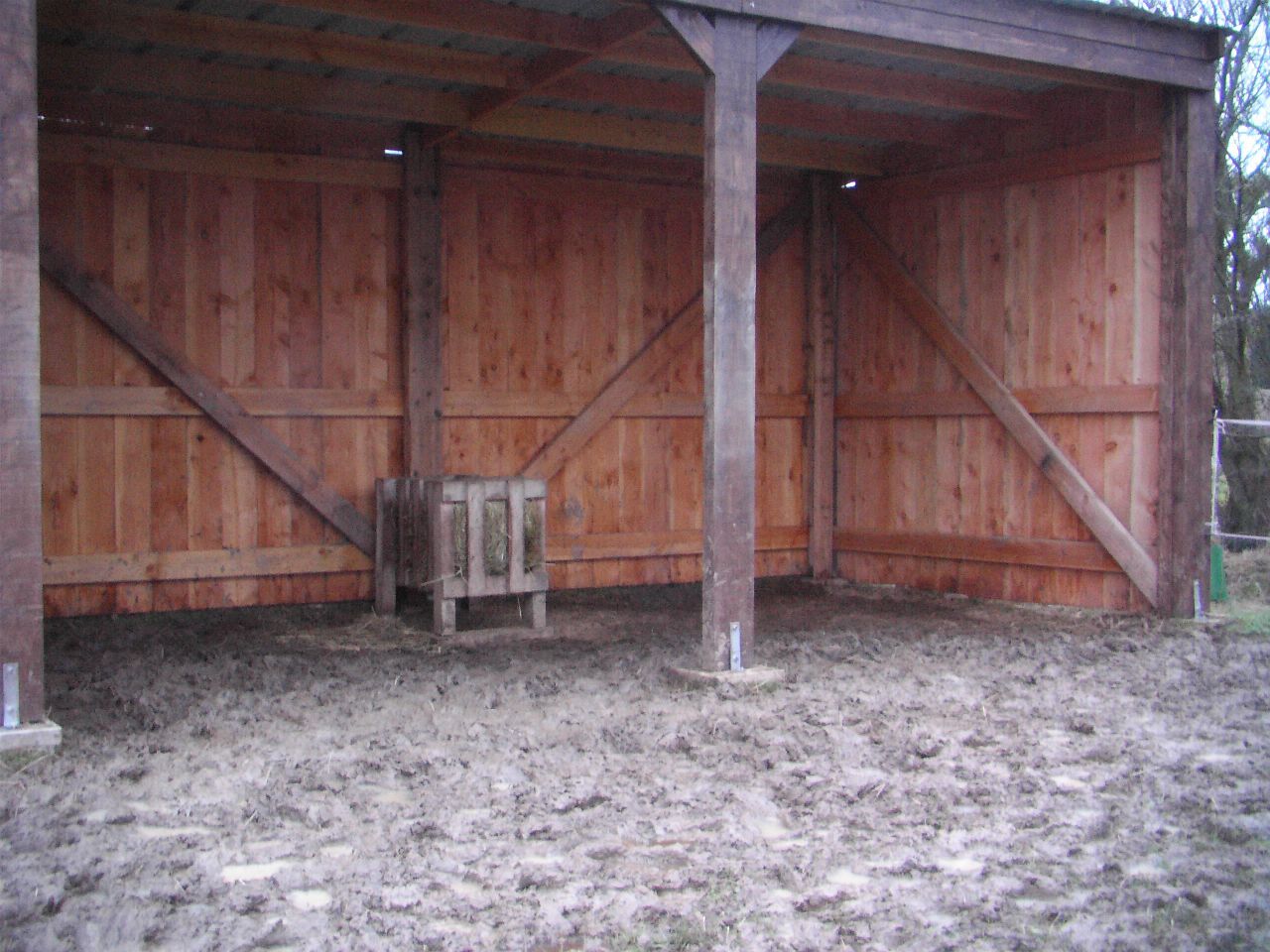 | Dire merci | C'est ce qu'on a chez nous en ce moment. Un abri au sol bétonné, le paddock est en partie stabilisé avec du tout venant (et geotextile en dessous) et ils ont accès à un petit bout de pré boueux. ![]() Au moins ils peuvent s'abriter et manger les pieds au sec. On va tester des dalles là au lieu de remettre des cailloux autour du râtelier. |