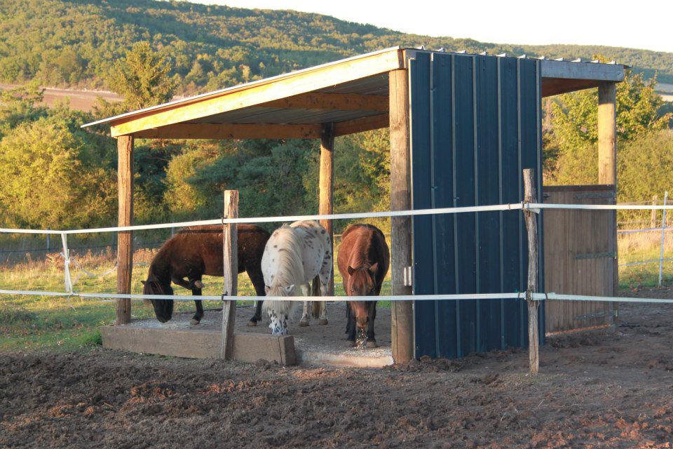 | Dire merci | Chez moi, il y a un 4*9 a cheval sur 2 paddocks et un 4*3 pour les shets. On a utilisé des poteaux EDF de récup, acheté des bastaings et des tôles. En fouinant pour trouver des lots de tôles d'occas, le grand abris nous est revenu à 400 euros (toit et bardage tôles) et le petit, on a acheté que les bastaings (moins de 100, euros) c'est une entreprise qui refesait son toiut qui nous a donné les tôles... C'est impecc pour mes castors, il a juste fallu poser de la corniére metallique sur les bastaings parce qu'ils bouffent tout!!!! voilà le petit des shet en cours de fabrication [url=https://www.1cheval.com/membre/services/photos/images/142188.jpg] ![]() [/url] Et là voilà le grand avant que le bardage bois ne soit remplcé par des tôles... [url=https://www.1cheval.com/membre/services/photos/images/136089.jpg] ![]() [/url] |