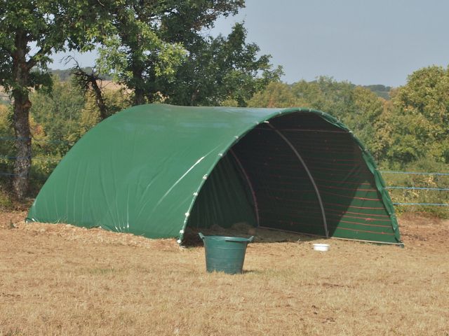 | Dire merci | Pour les tentes militaires : VECAMA Pour éviter que le cheval se gratte sur un abri léger, il faut installer l'abri à proximité d'une clôture, et tirer une ligne électrique alimentée pour le protéger. Eventuellement, passer à l'intérieur également... ![]() Et c'est adaptable pour un tunnel également. |