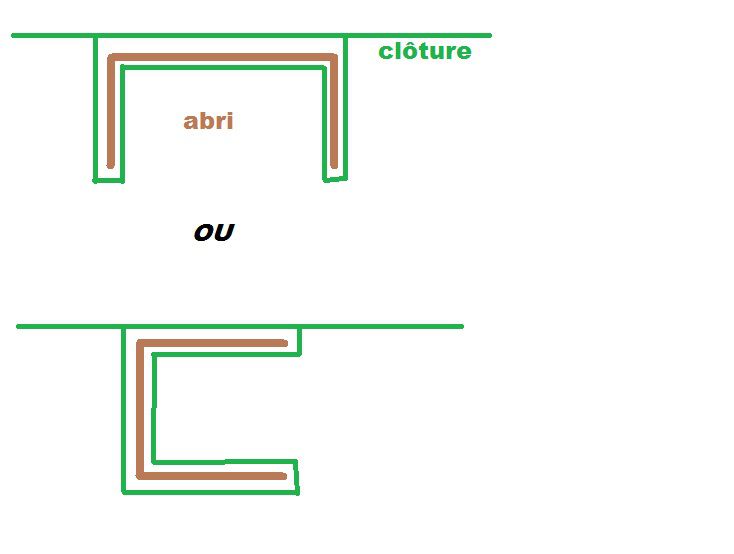 | Dire merci | Tiens ce sujet va m'aider... Donc si on fait deux abris de 20m² mais espacé de 2m on a le droit ? (un pour les chevaux et un pour le foin) si on en rejoins pas comme Paquita12, car effectivement si on rejoins il est évident qu'on va compter la surface totale ... Pour deux chevaux, il vaut mieux un 4*5 ou un 3*6 ? (sachant que j'ai aucune idée de l'entente car pour l'instant j'en ai qu'une). |
